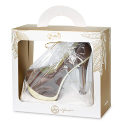 Pieninio šokolado figūra, papuošta baltuoju šokoladu, elegantiškoje dėžutėje su rankenėle.