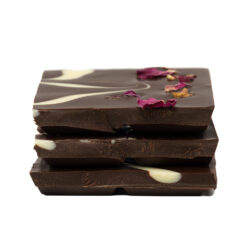 Dark chocolate decorated with white chocolate and rose petals is a combination of elegance and a subtle aroma.