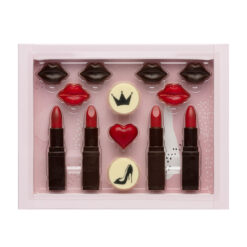 A playful product made to give. The packaging includes decorated figures in the shape of a lipstick, lips and heart as well as a chocolate decorated with crown and shoe symbols.