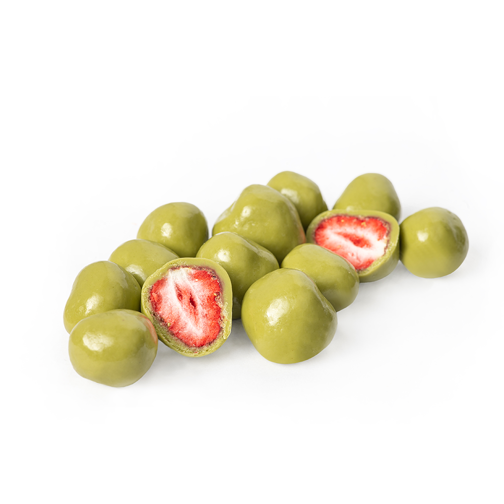 The freeze-dried strawberries in white chocolate with matcha are an excellent choice for those wanting a unique sweet treat. The sweet and tart strawberries, the strong flavour of the white chocolate and the slight bitterness of the tea result in expertly balanced flavour, colour and aroma. Matcha is a type of green tea with a mildly bitter, strong flavour that perfectly complements both the white chocolate and the strawberries.