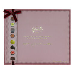 he festive gift set “Rūta” consists of: crispy almonds in white chocolate “Žara” (100 g), crispy almonds with Ruby chocolate and black currant (100 g), cranberries in dark chocolate (50%) (100 g), chocolate collection “Dreams Come True!” (66 g), orange-flavoured hot chocolate (50%) (250 g).