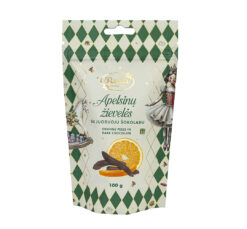 Apelsinų žievelės pateikiamos šventinio dizaino pakuotėje, kurioje susipina nostalgija dvelkiančių žiemos švenčių nuotaika, šventiniai stebuklai ir vaikystės prisiminimai.