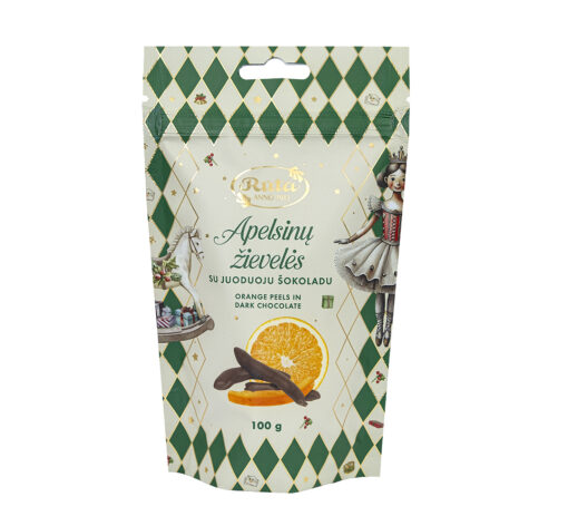Išraiškingo skonio džiovintos apelsinų žievelės su juoduoju šokoladu – klasika tapęs gaminys. Apelsinų žievelės pasižymi citrusiniu aromatu ir subtiliu karčiai saldžiu skoniu.