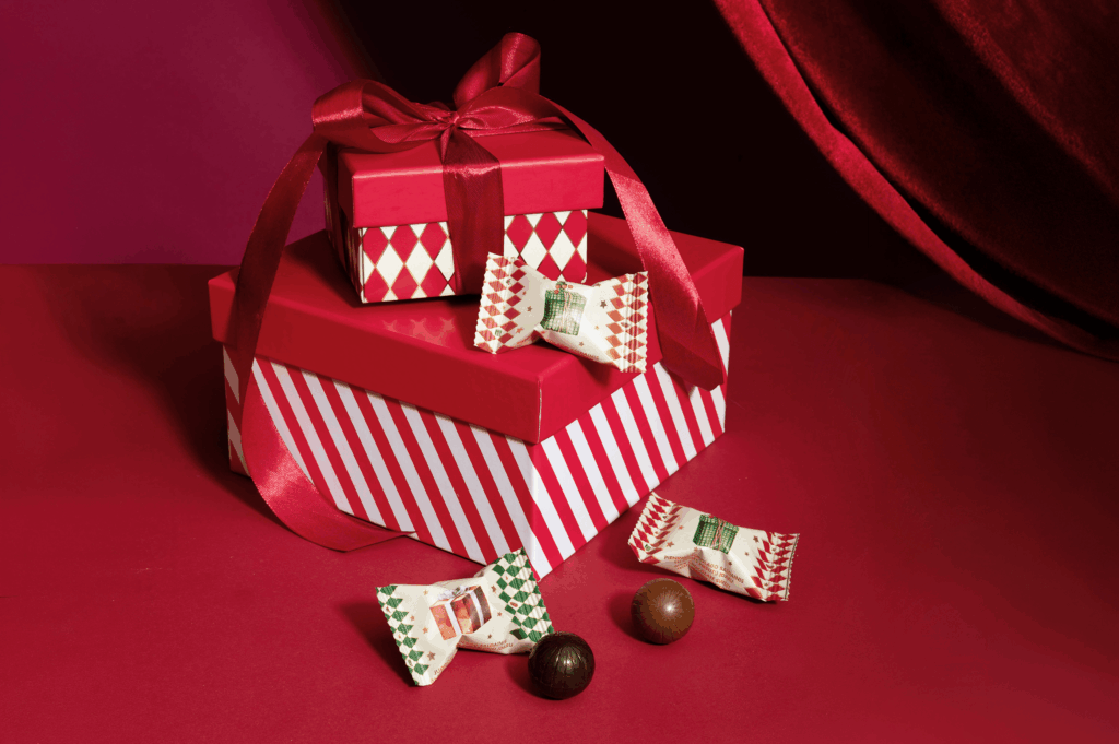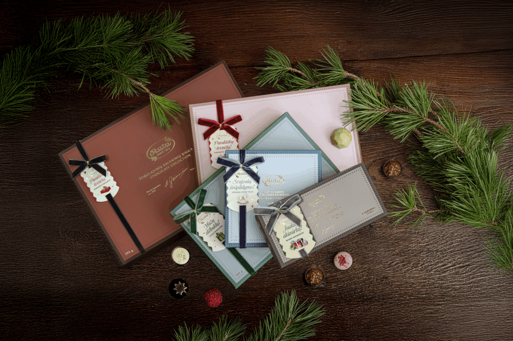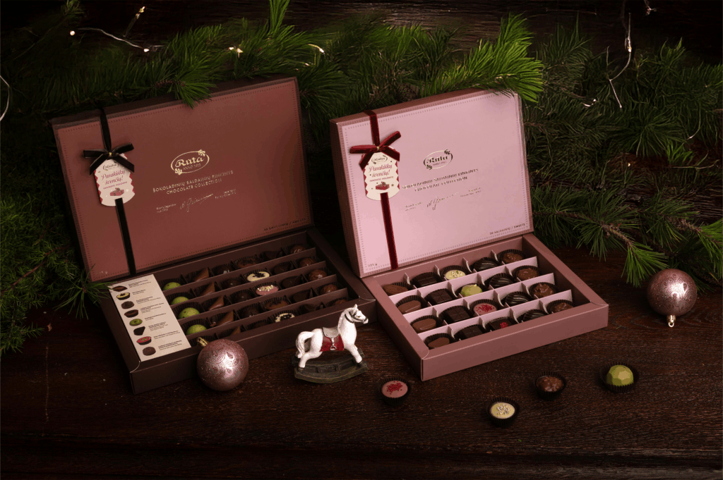 Šventiniame asortimente – elegantiška šokoladinių saldainių kolekcija „Skonių legendos nuo 1913“. Ją sudaro net penkių skirtingų dydžių šokoladinių saldainių rinkiniai, kurie tiks įvairioms progoms – mažai dovanėlei, didelei staigmenai ar tiesiog pasilepinimui. Tai subtilios elegancijos dėžutės, dekoruotos aukso spalvos elementais, prabangiu kaspinėliu ir šventine kortele su šiltu palinkėjimu.