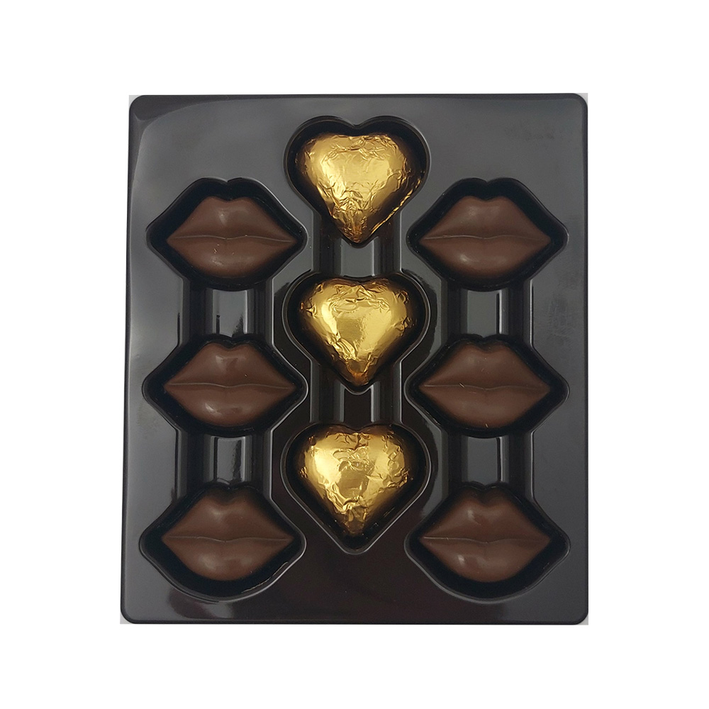 – Širdelės ir lūpų formos pieninio šokolado figūrėlės.