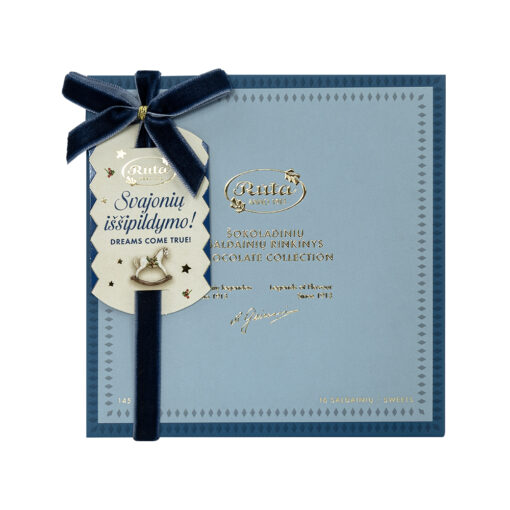 Subtilios elegancijos dėžutėje, dekoruotoje aukso spalvos elementais ir prabangiu kaspinėliu, rasite 16 rankų darbo šokoladinių saldainių. Iš viso rinkinyje – 4 rūšių saldainiai, kuriuos vienija išskirtinis dėmesys detalėms ir skoniui. Dėžutę puošia šventinė kortelė su šiltu palinkėjimu – „Svajonių išsipildymo!“, o jos vidų – įmonės legenda.