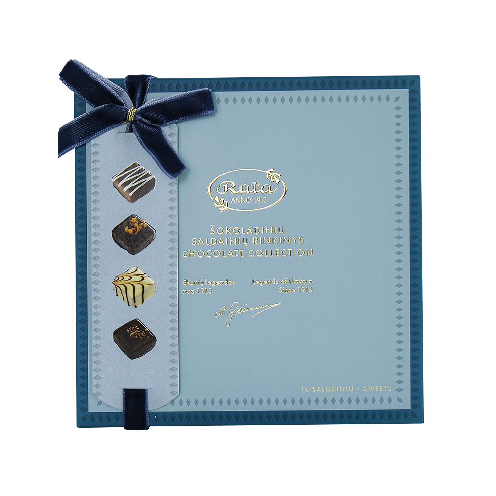 Šokoladiniai saldainiai pateikiami subtilios elegancijos dėžutėje su aukso spalvos elementais, prabangiu kaspinėliu ir kortele su saldainių fotografijomis. Dėžutės viduje – trumpa įmonės legenda, kviečianti pažinti skonių istorijos pradžią.