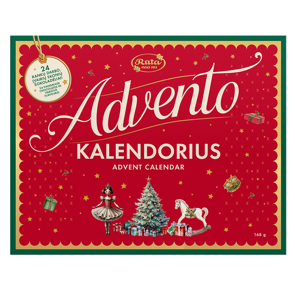 „Rūtos“ advento kalendorius – švenčių laukimo skonis! Pasitikite šventes keliaudami per 8 išraiškingus skonius, subtiliai derinamus su 3 skirtingų rūšių šokoladu: juoduoju, pieniniu ir baltuoju. Šis advento kalendorius – tai 24-šokoladėlių rinkinys, kuriame kasdien atvėrę langelį su palinkėjimu, rasite ypatingą šokoladinį malonumą. Tegul šios 24 dienos pripildo Jūsų namus šokolado, šilumos ir meilės!