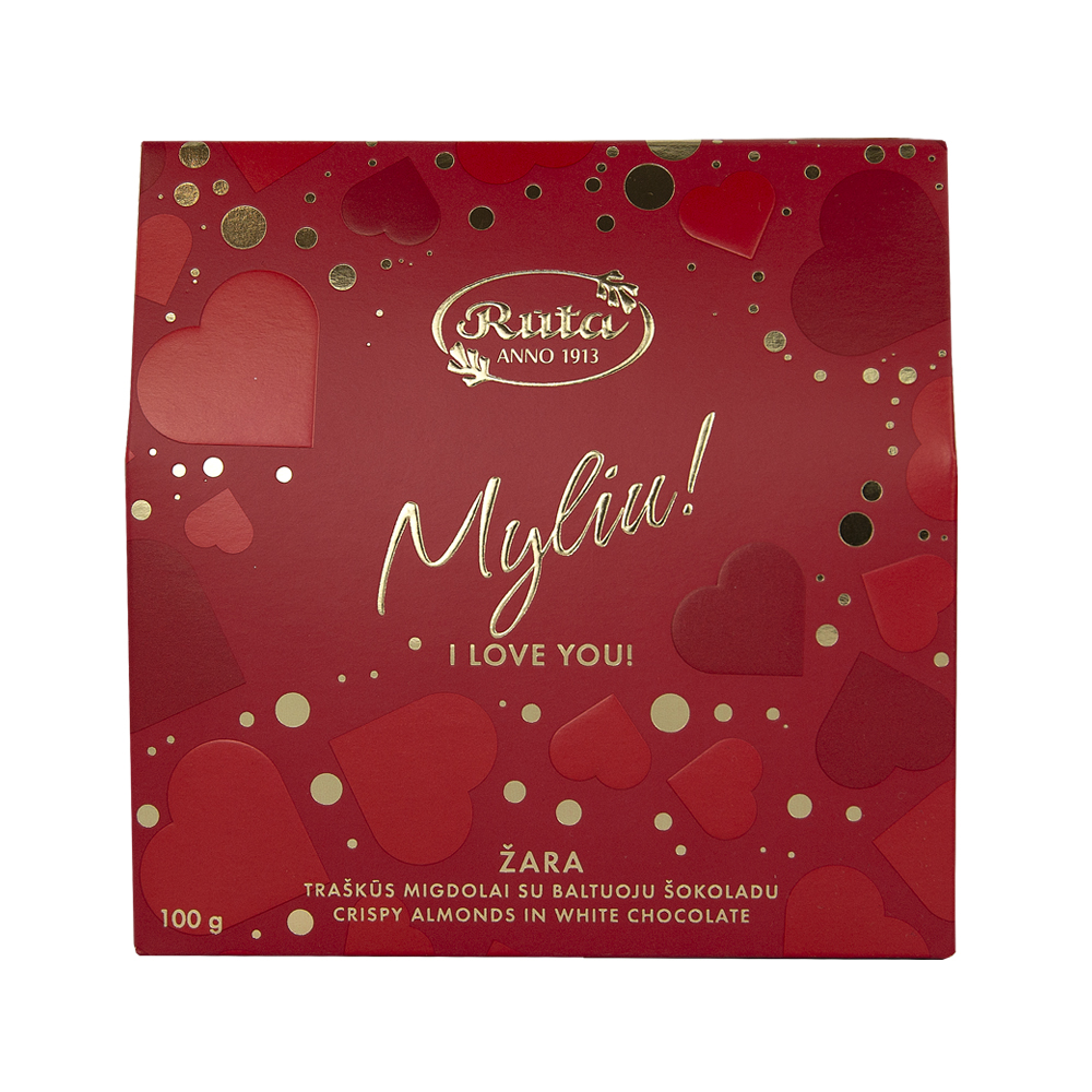Elegantiškos formos, širdelėmis puoštoje pakuotėje – pieno karamelės, romo, konjako ir amareto skonio migdolai su baltuoju šokoladu. Keturi, nepriekaištingai suderinti skoniai puikiai papildo baltąjį šokoladą.