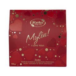 Traškūs migdolai su baltuoju šokoladu „Žara“. SALDŽIOS MEILĖS! (širdelės formos dėžutė), 100 g